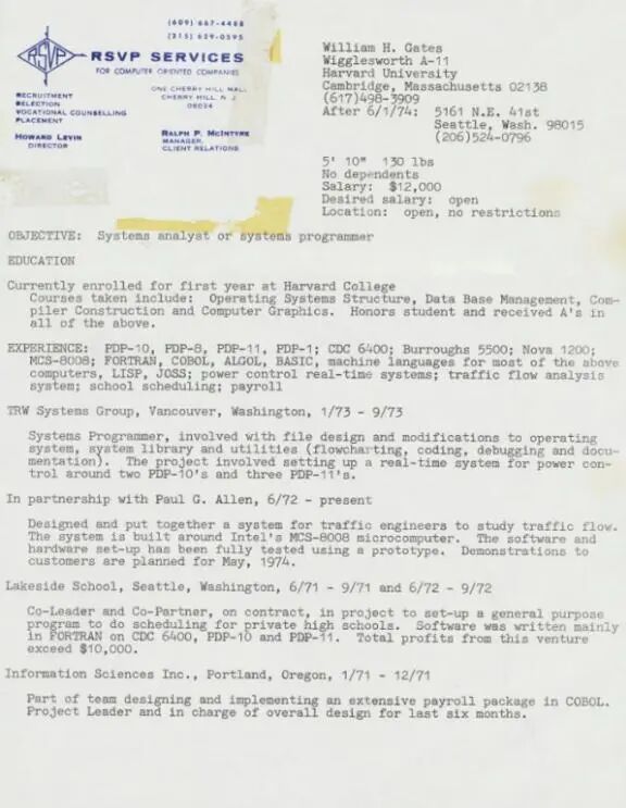 最近,微软联合创始人比尔盖茨在社交网站上分享了一份自己的旧简历,并配文:“无论你是刚毕业的学生还是大学辍学生,我相信你的简历比我48年前(1974年)的好看多了。”