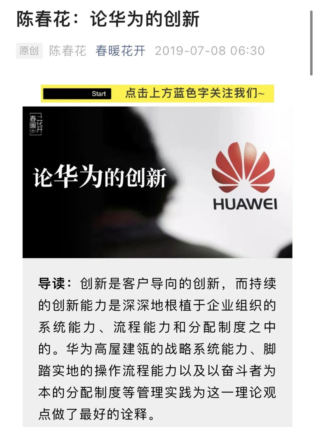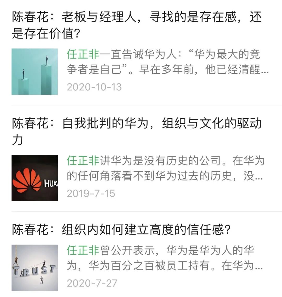 我在陈春花【春暖花开】的公众号上,也找到了不少由陈春花署名撰写的、有关华为和任正非的文章。