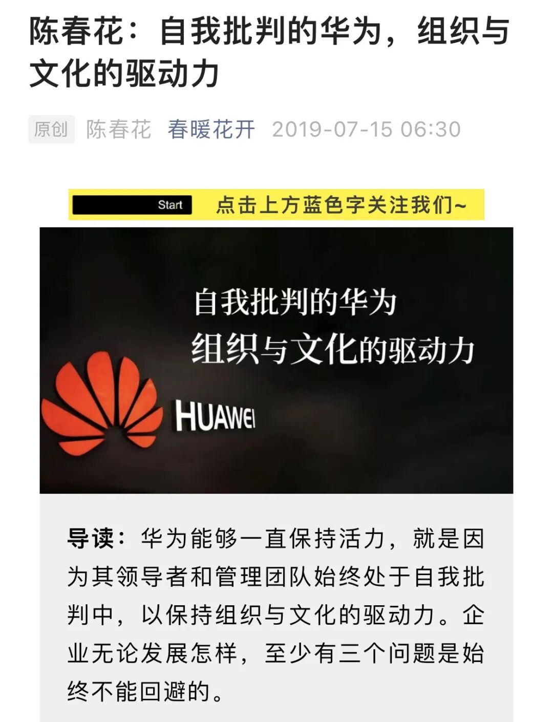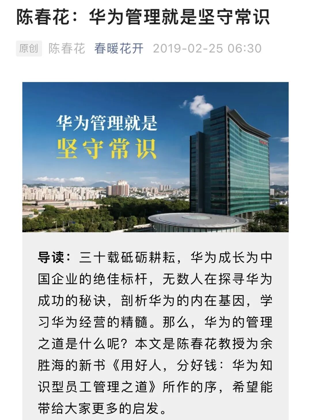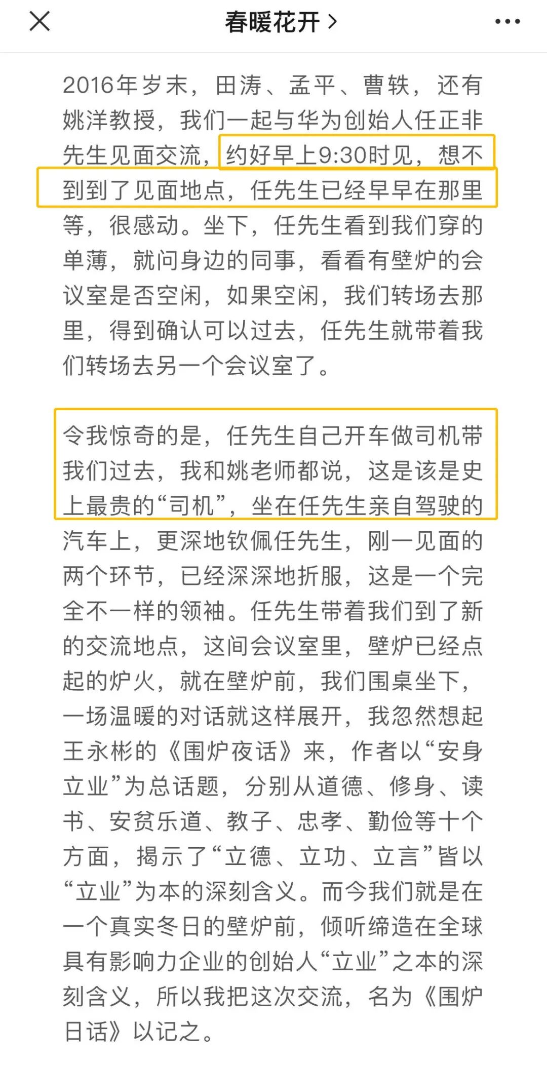 总结一下,就是陈春花在文章里把任正非夸了一通,说他待人很亲和,不仅提前在公司等待她们的到访,还亲自开车带路,是一个“完全不一样的领袖”。