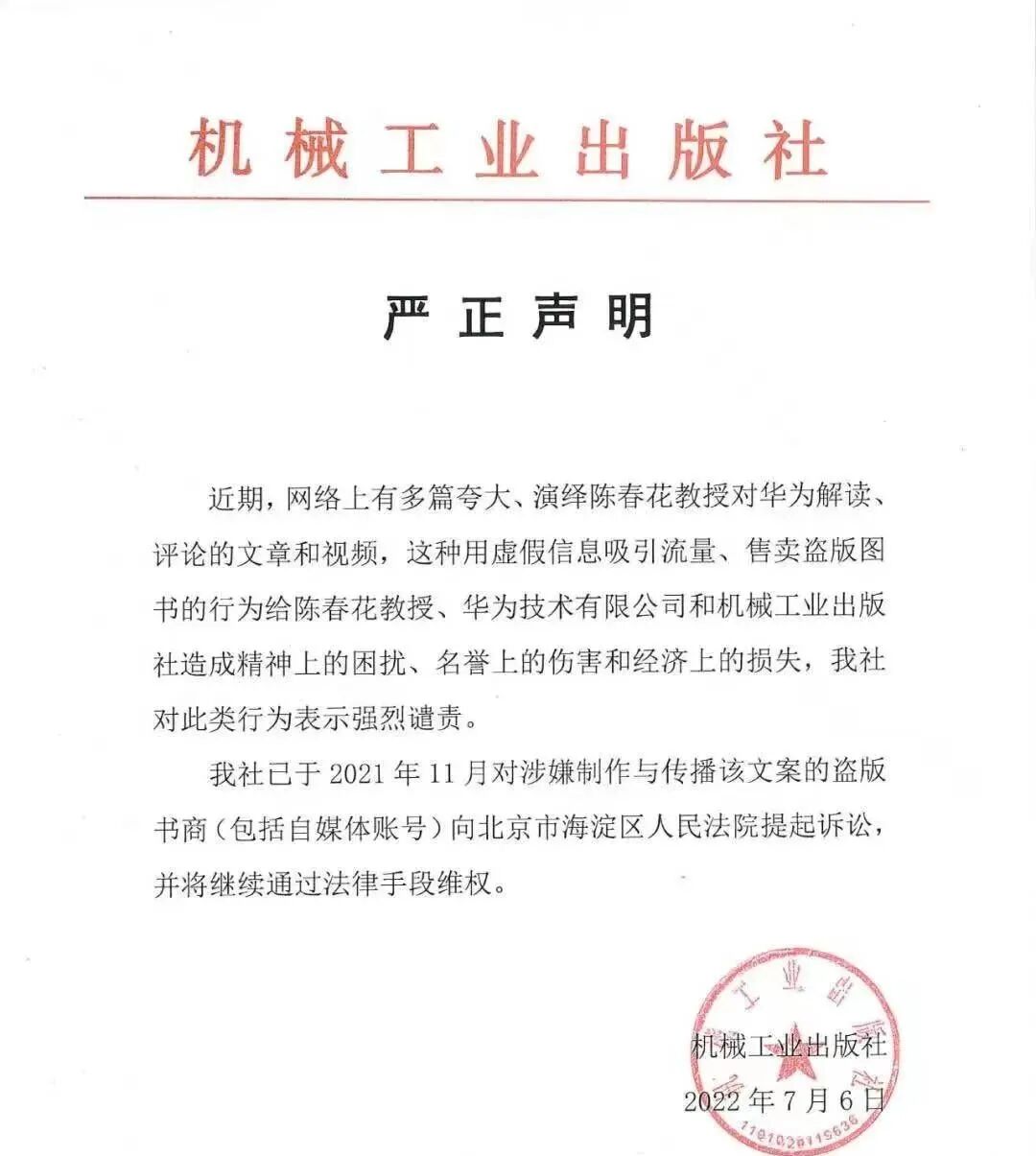 陈春花声明称: