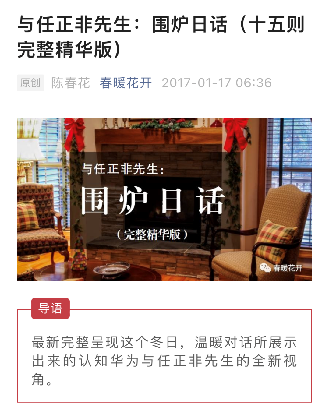 当年1月17日,陈春花在其微信公众号【春暖花开】上,署名发表了一篇和华为创始人任正非面对面对话的文章。
