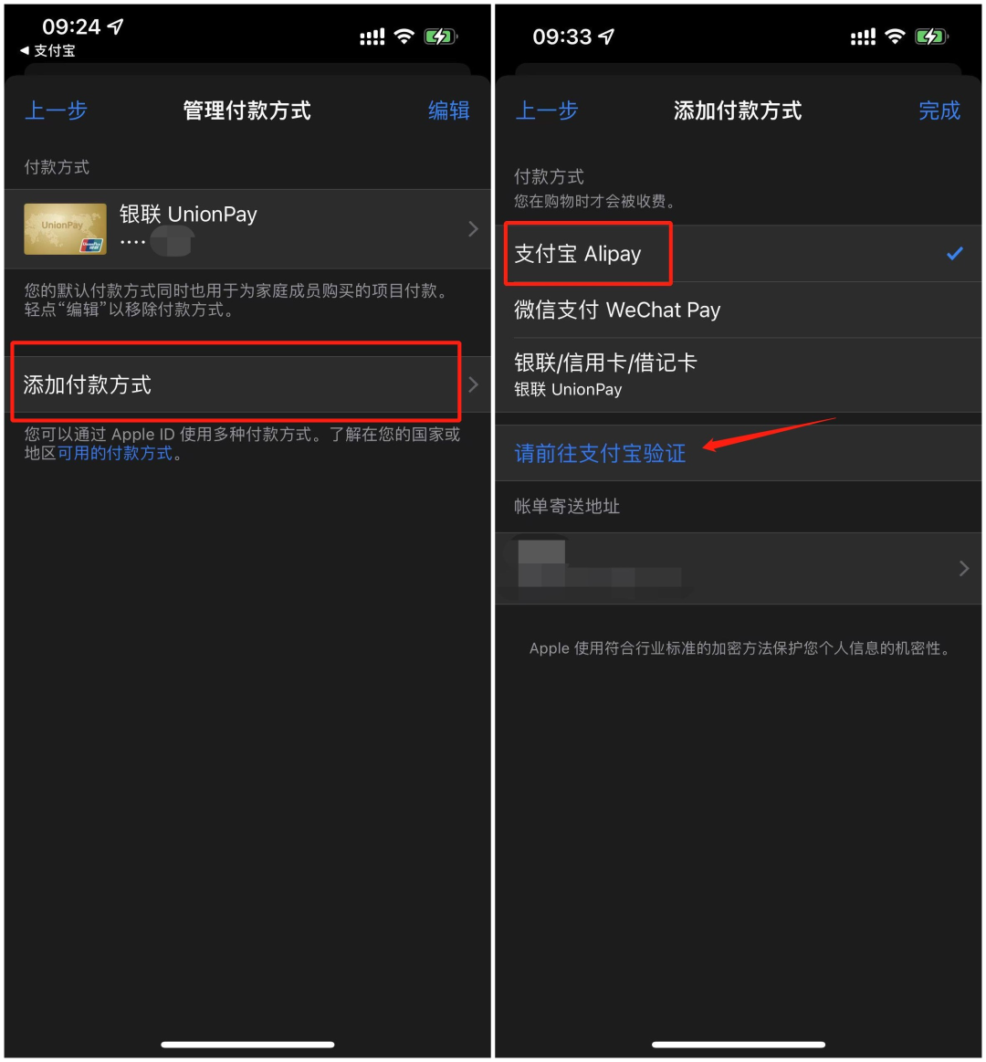 点击【添加付款方式】,勾选【支付宝】,并【前往支付宝验证】。
