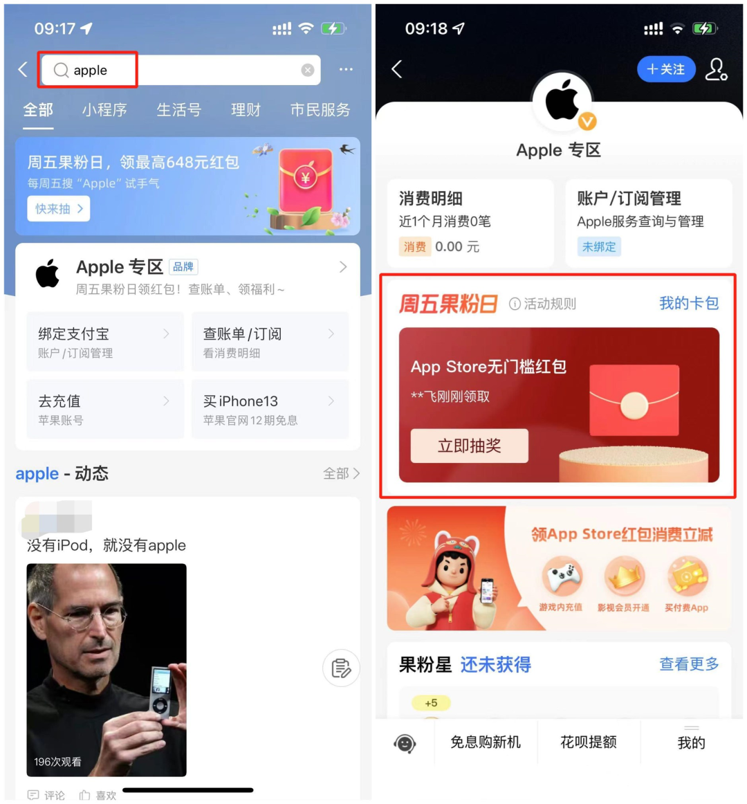 打开支付宝搜索Apple,点击【Apple专区】,找到【周五果粉日】活动抽奖。