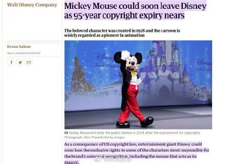 根据英国《卫报》的最新报道,随着“米老鼠”95年版权保护期的临近,迪士尼于后年(2024年)或将失去这个公司最具代表性的卡通形象的专有版权。