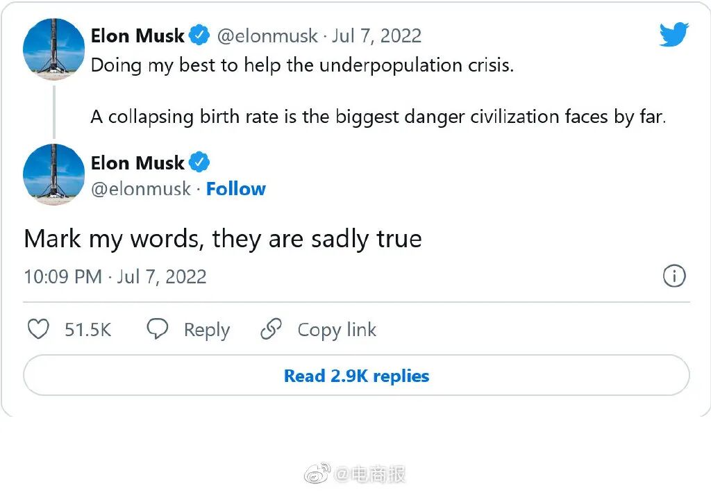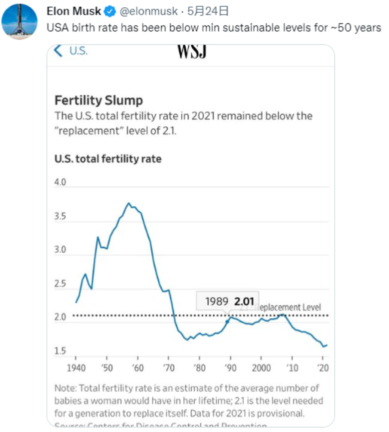 马斯克此前就在操心生育率的事情,他认为,人类文明如果想要发展,尤其是走向浩瀚的太空,就必须保持人口正增长。