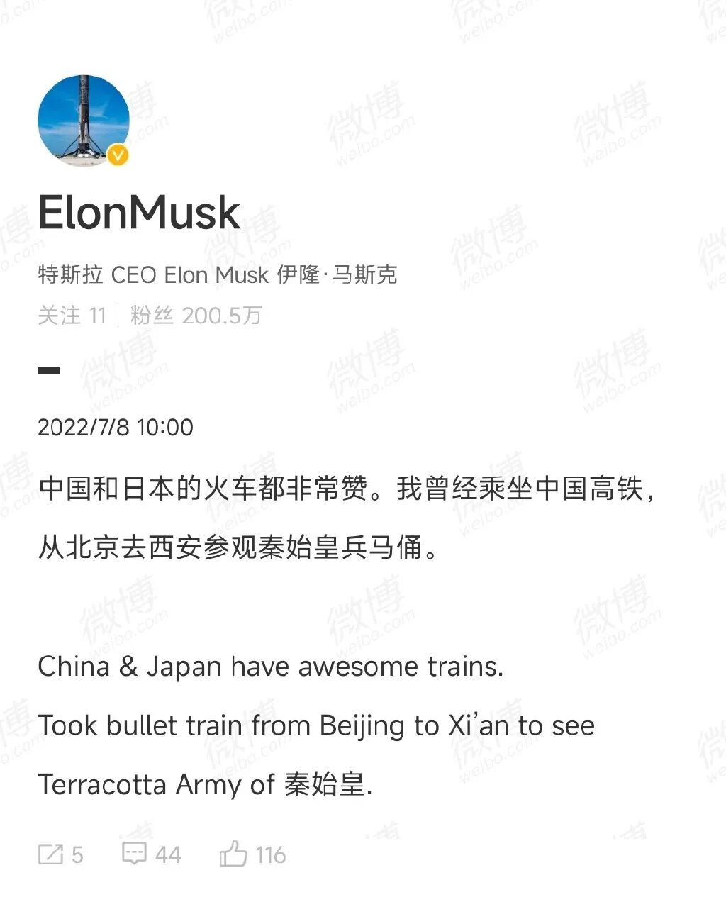 马斯克一上来就开启夸夸夸模式,他称:“中国和日本的火车都非常赞。我曾经乘坐中国高铁,从北京去西安参观秦始皇兵马俑。”