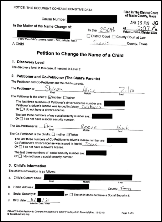 马斯克与齐里斯,四月共同在得克萨斯州特拉维斯县申请要求更改两个孩子的名字,以便其 "拥有父亲的姓氏,同时中间名包含母亲的姓氏"。