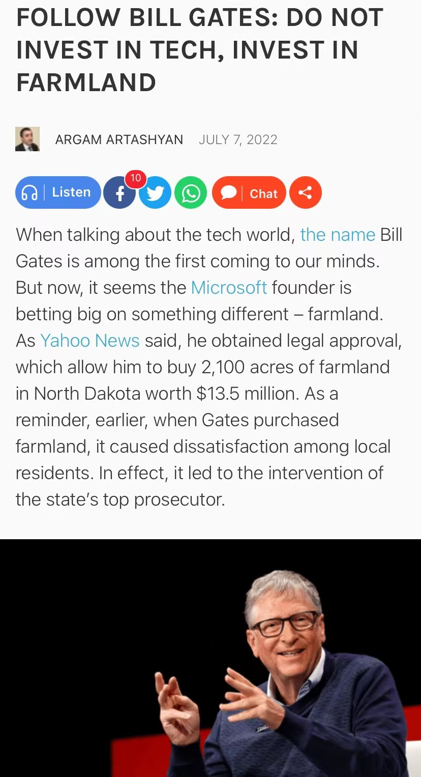 而比尔盖茨的26.9万英亩农田耗资约75亿元人民币。