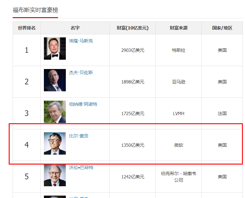 根据福布斯富豪榜的数据显示,比尔·盖茨目前个人财富累计1293亿美元(折合人民币就是好多好多好多好多钱),位居全球第四,仅次于贝佐斯、马斯克、LV掌门人阿诺特。