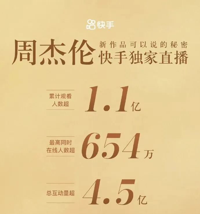 网易科技:周杰伦快手独家直播累计观看人数超1.1亿,互动总量超4.5亿