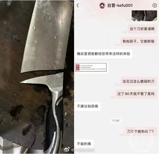 事情是这样的,最近一名广州的女网友,在张小泉的网店里买了一把菜刀,结果拍蒜的时候给拍断了……