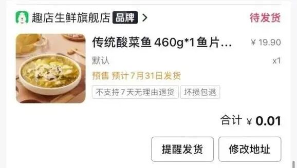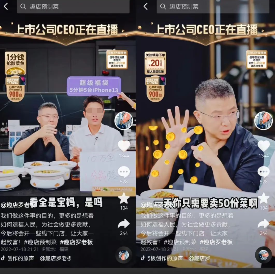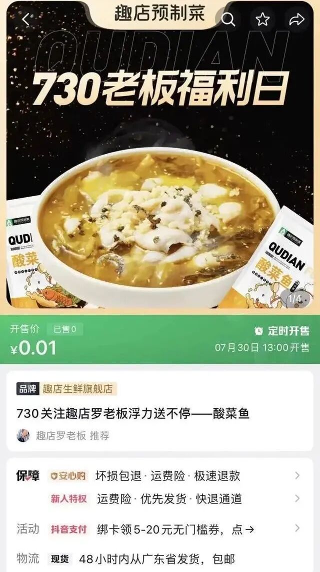 7月17天当天,厂商“趣店”在抖音直播间拿出了“1000万份原价19.9元的酸菜鱼预制菜”,以及其他各类预制菜品,以1分钱或远低于市场的价格包邮“大甩卖”。