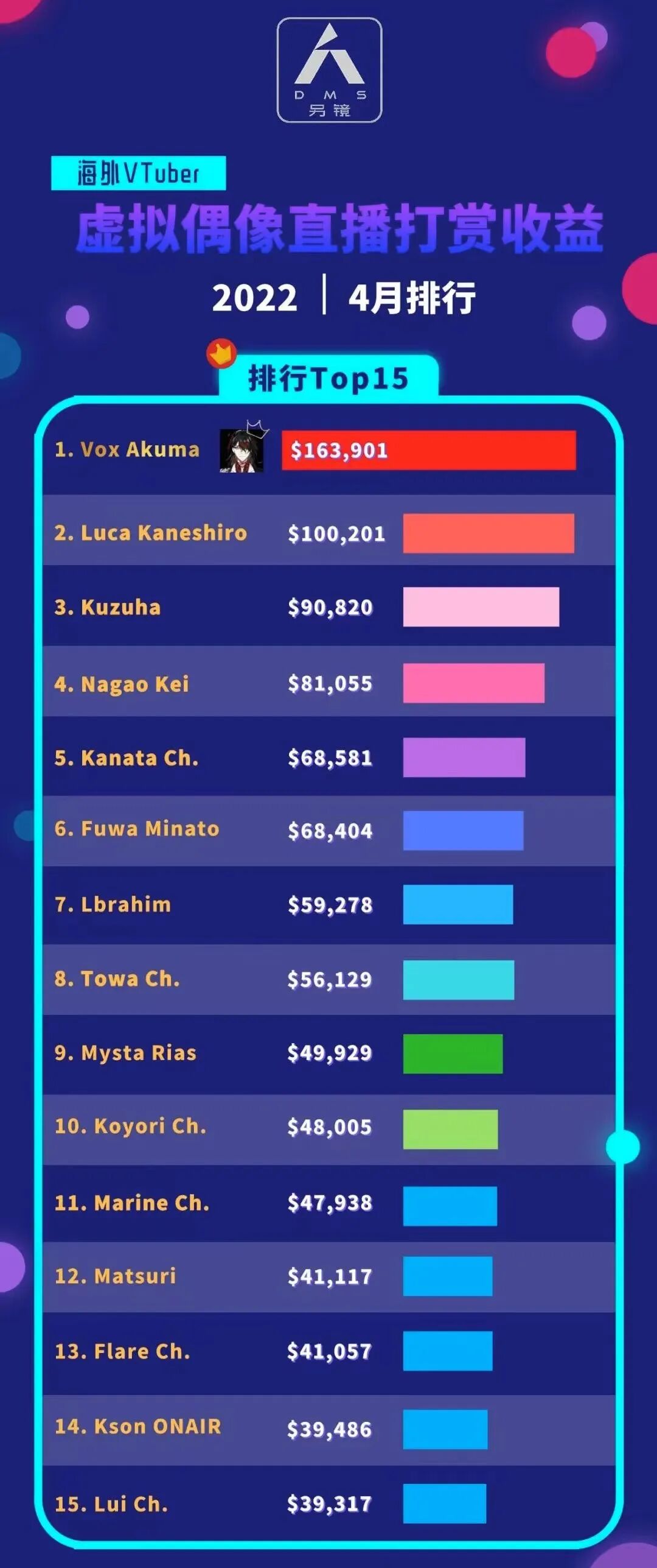 根据相关资料显示,在2022年4月YouTuber Superchat收益总榜中,一位名叫虚拟偶像Vox Akuma登上榜首,并且断层领先。