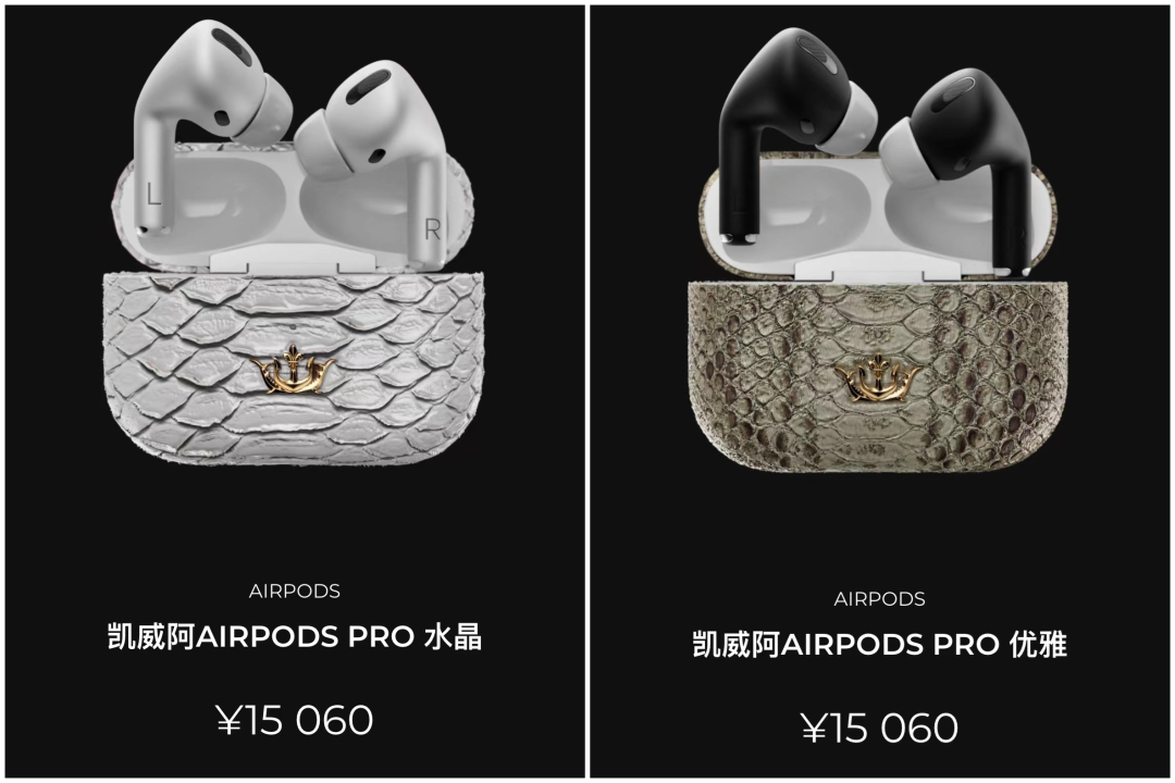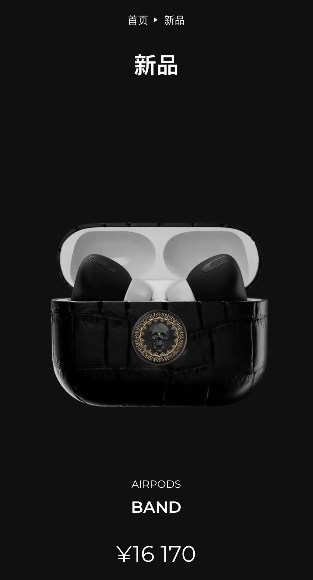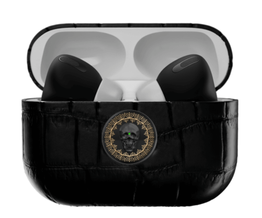 最近,俄罗斯和意大利合资珠宝商CAVIAR上线了一款特殊的Airpods,这款耳机主体为黑色,充电盒外部则是由黑色鳄鱼皮制成,并配有黑色钛金属骷髅头,周围则是一圈24K镀金花纹。
