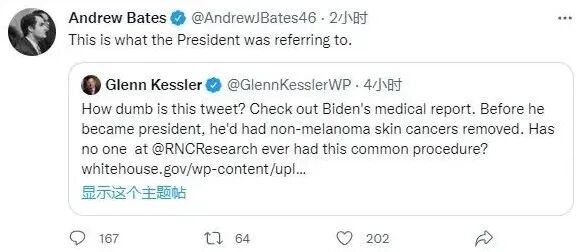好家伙,这通操作可给白宫吓够呛。白宫发言人安德鲁·贝茨(Andrew Bates)转发了《华盛顿邮报》专栏作家格伦·凯斯勒(Glenn Kessler)的推文并指出,拜登在上任前已经切除了“非黑色素瘤皮肤癌”。