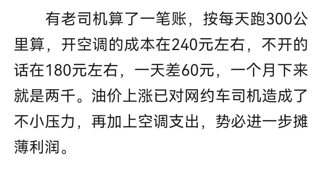 首先,司机不想开空调的原因,我们应该都能想到,就是不挣钱。
