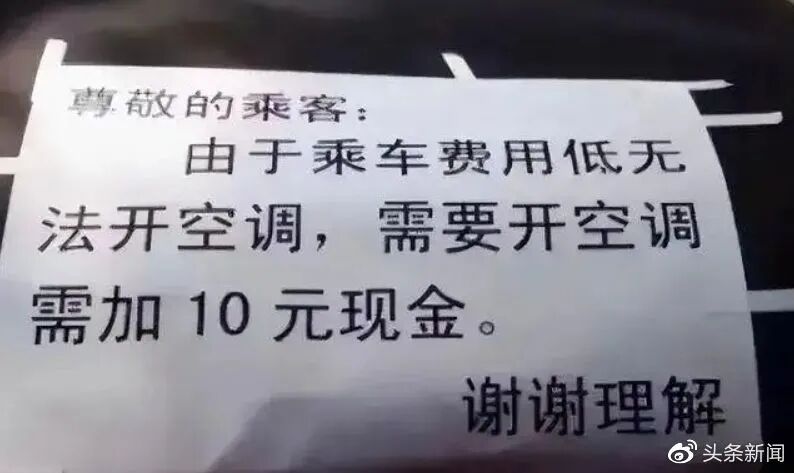 还有的司机直接在乘客座椅前贴上收费通知单,要求“开空调加收10元现金”。