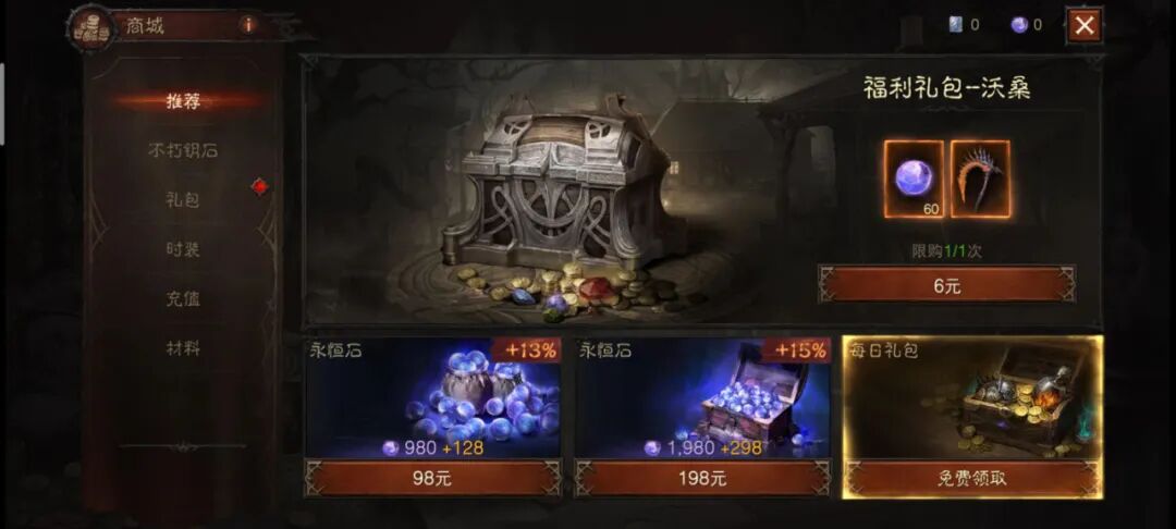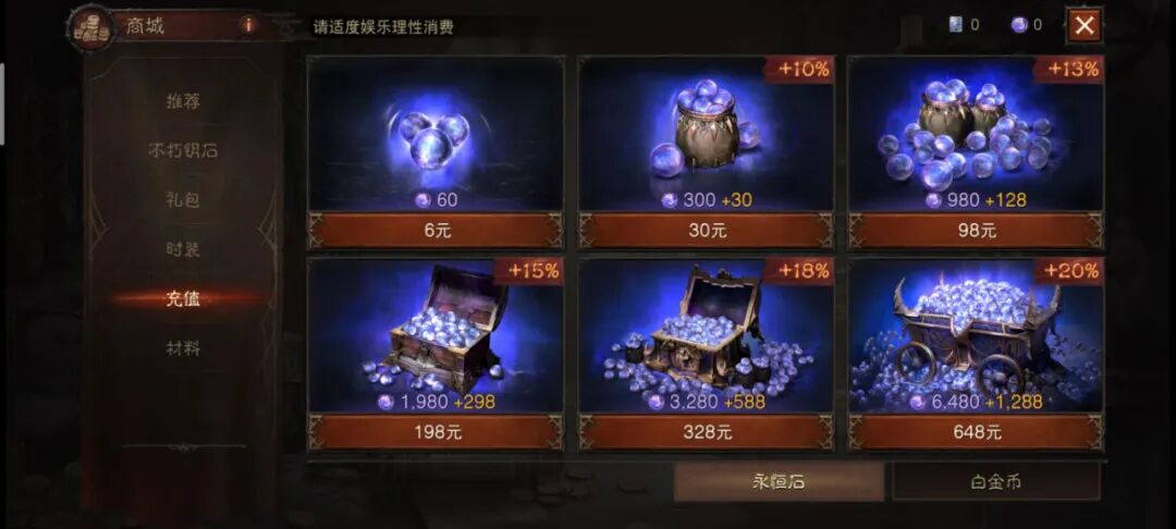 付费项目主要分为钱币消费以及宝石、钥匙消费,从6元到648元不等。