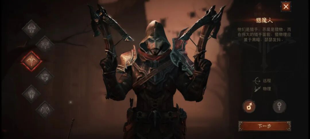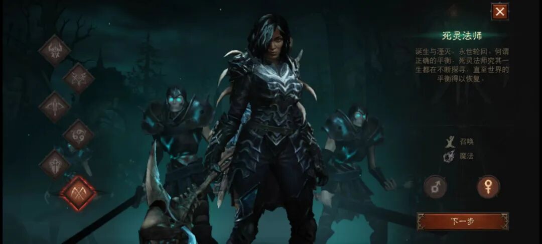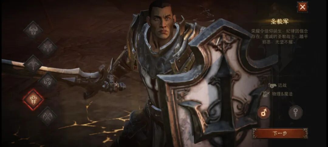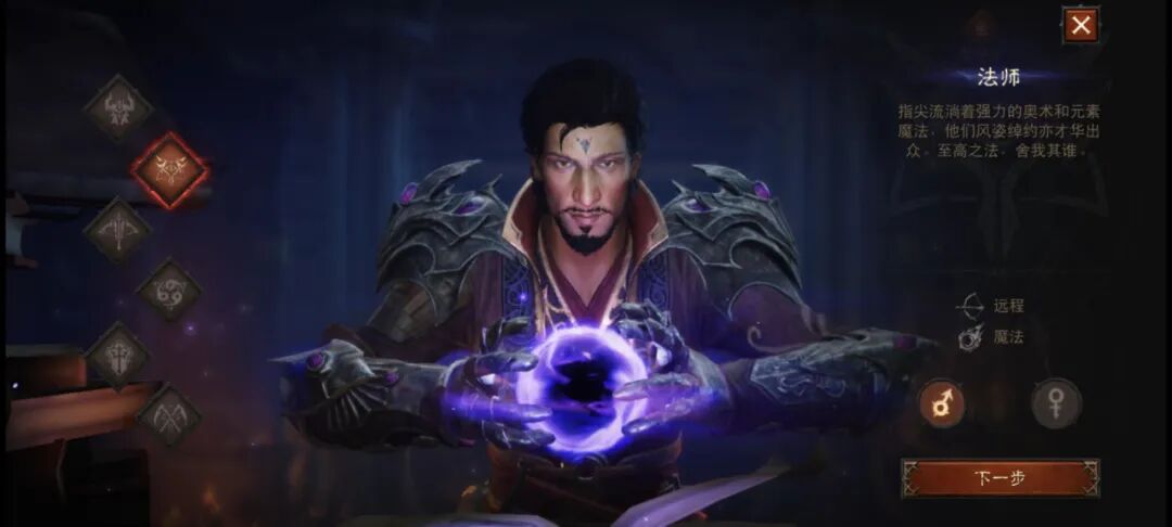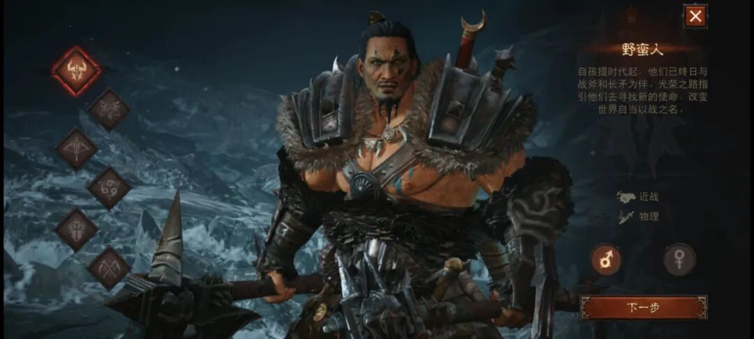 我也试着体验了一把,目前游戏内开放了野蛮人、圣教军、猎魔人、武僧、死灵法师、魔法师共6个职业,这点基本和PC端一致。