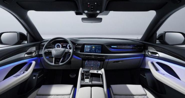 内饰部分,新车采用了奥迪最新技术虚拟座舱、中控上下联屏和仪表盘组成三联屏,同时全系车型均使用进口Nappa真皮来包裹方向盘,座椅处大面积的软性材质彰显出整车豪华感。