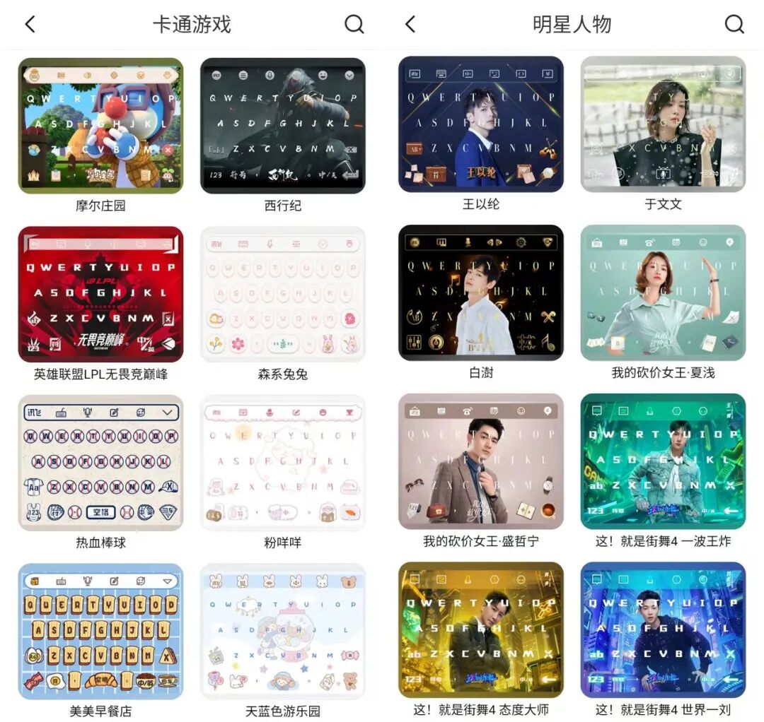 “AI颜键盘”还拥有超高颜值,不仅量身定制游戏、明星、卡通、动漫皮肤,还上线了机械、美妆、古风、潮酷等炫酷设计。