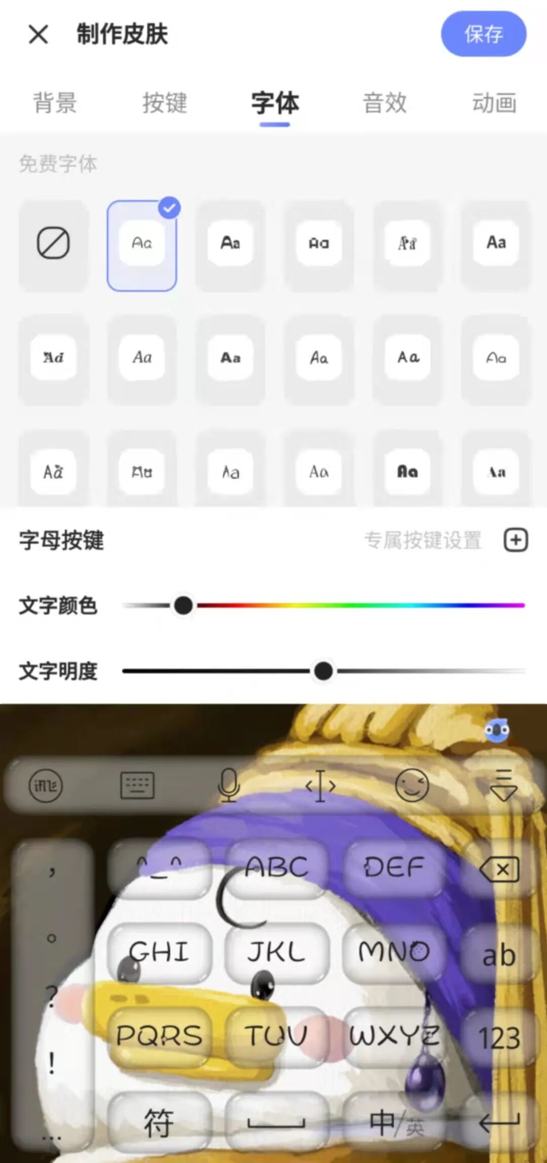 此外,自定义键盘皮肤功能也得到了全新的升级,我们可以根据自己的喜好上传背景图片,gif图也支持,按键、字体、音效甚至敲击动画均有多种款式可选。
