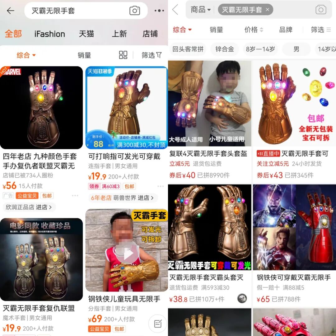 咱虽然买不起1.7亿的官方联名无限手套,但淘宝、拼多多上19.9元一个的“同款”还是能买来玩玩的。