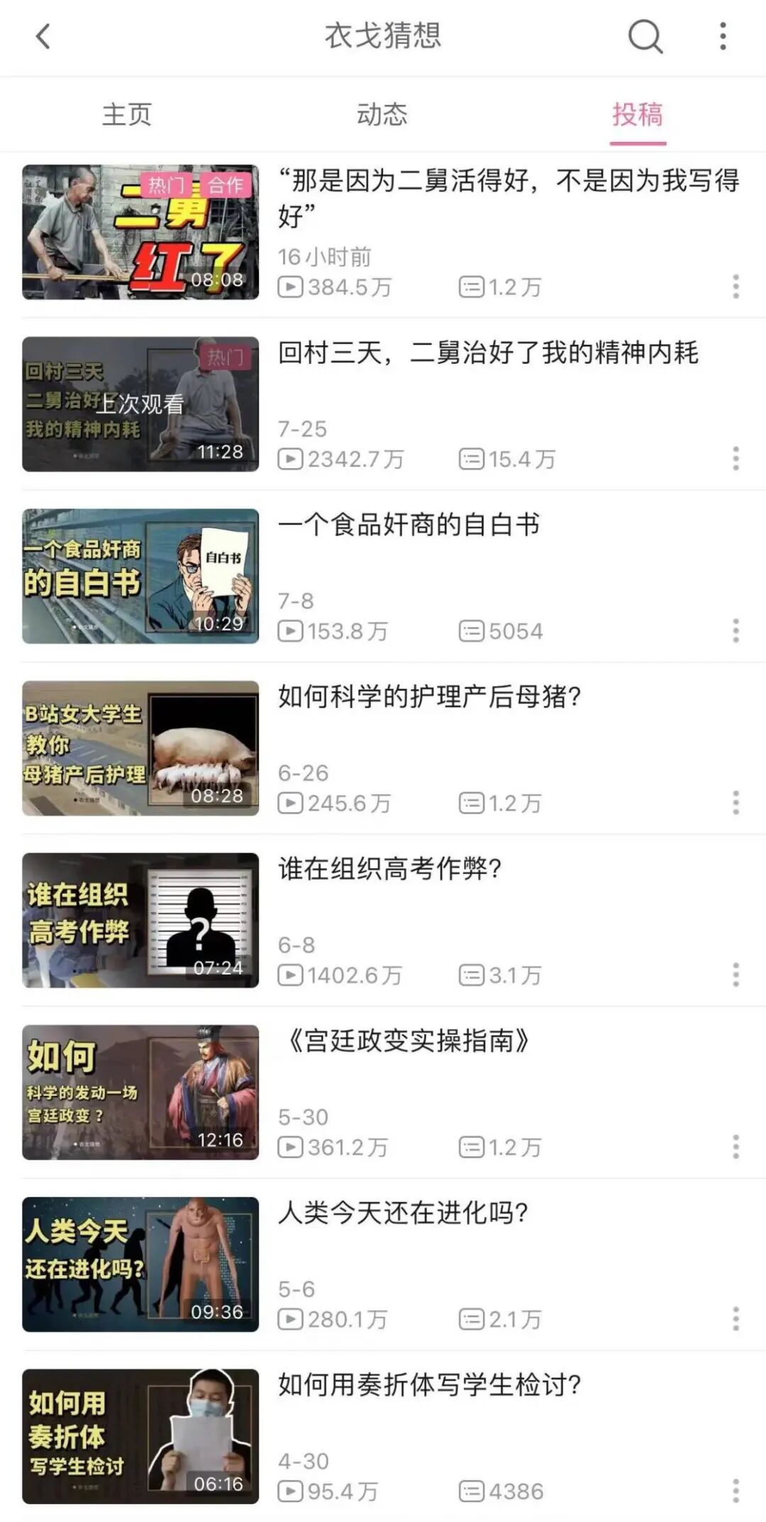 视频作者衣戈猜想,本名叫唐浩,标准90后青年,是一位北漂的历史老师,从2020年开始在B站投稿,用他自己的介绍,自己只是个愿意发散的创作者,这次的“二舅”是他发布的第35条视频。