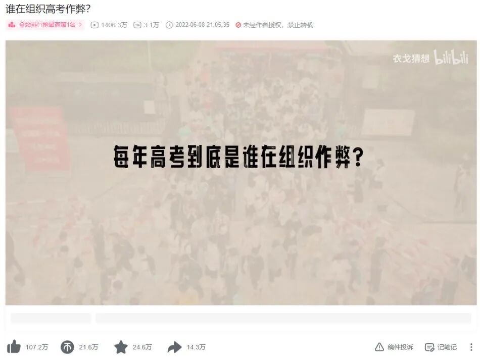其中一条《谁在组织高考作弊?》也曾冲上过B站排行榜第一,有着1402万的播放量。
