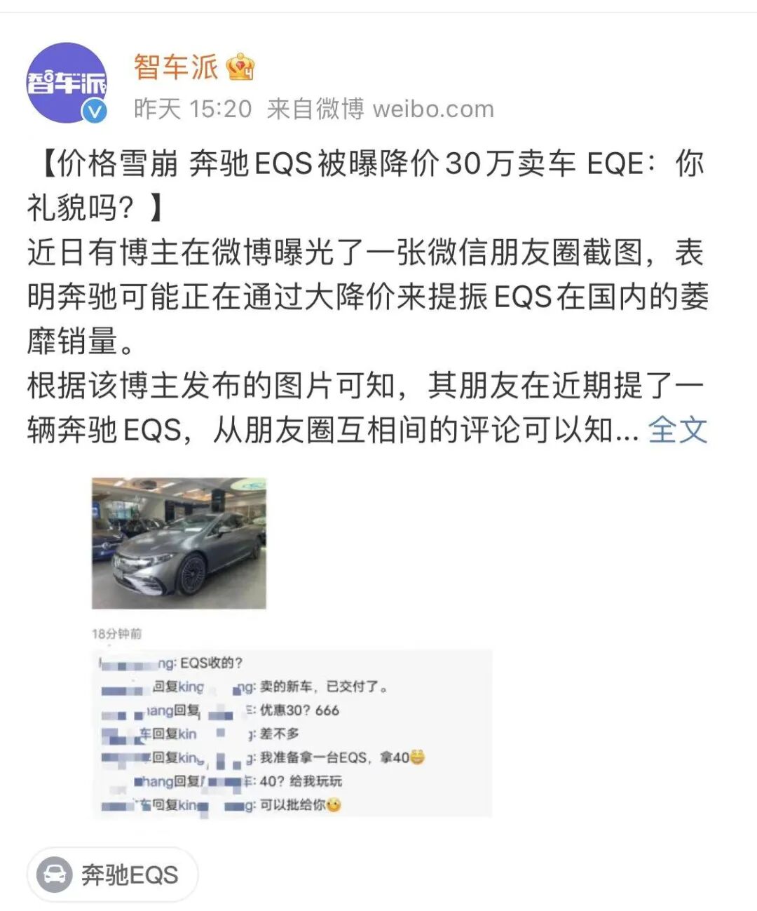 据汽车媒体报道,奔驰EQS被曝降价30万。