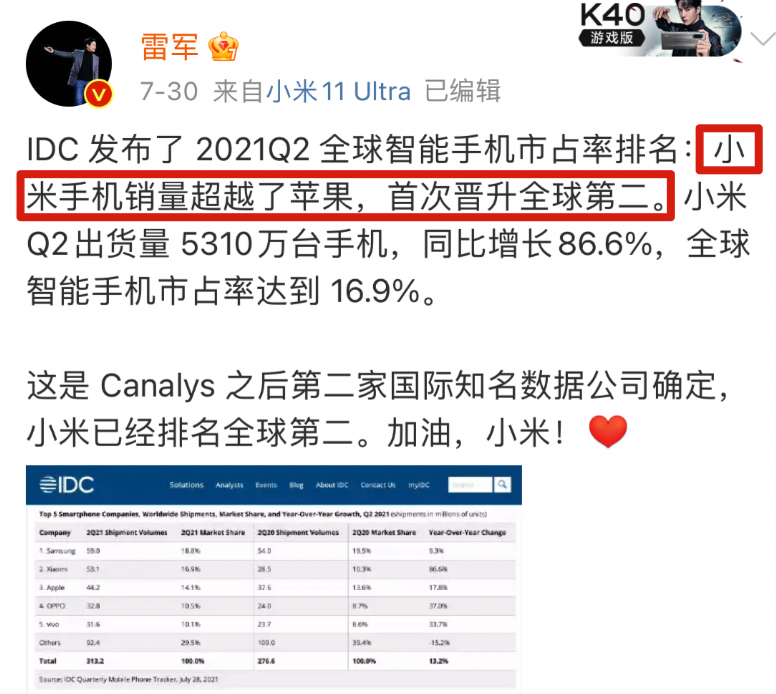 殊不知,仅7年光景,雷军带领着小米手机,超越🍎、正式挤身全球第二!