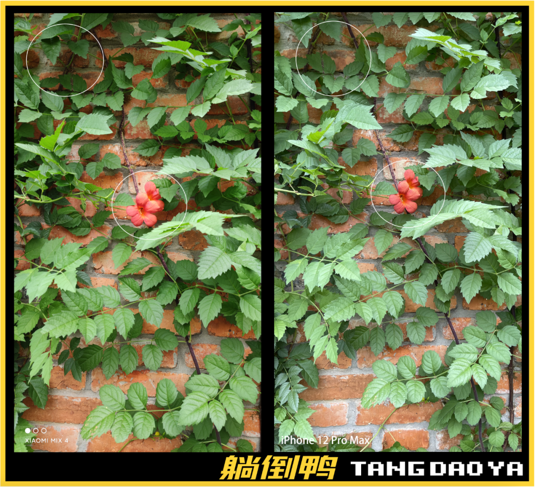 小米MIX 4(左)拍摄的叶片迎光面没有出现泛白,左上角阴影面层次明显更多,花朵色彩还原也更讨好眼球,但叶片锯齿和花朵细节还原不如苹果的锐利丰富