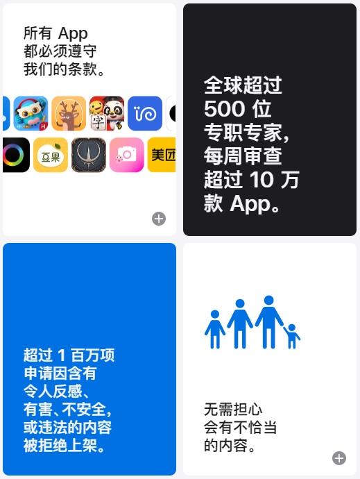 按照苹果官网的介绍“全球超过500位专职专家,每周审查超过10万款App。超过1百万项申请因含有令人反感、有害、不安全,或违法的内容被拒绝上架。”