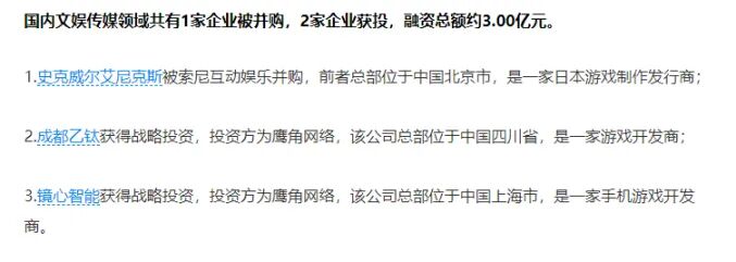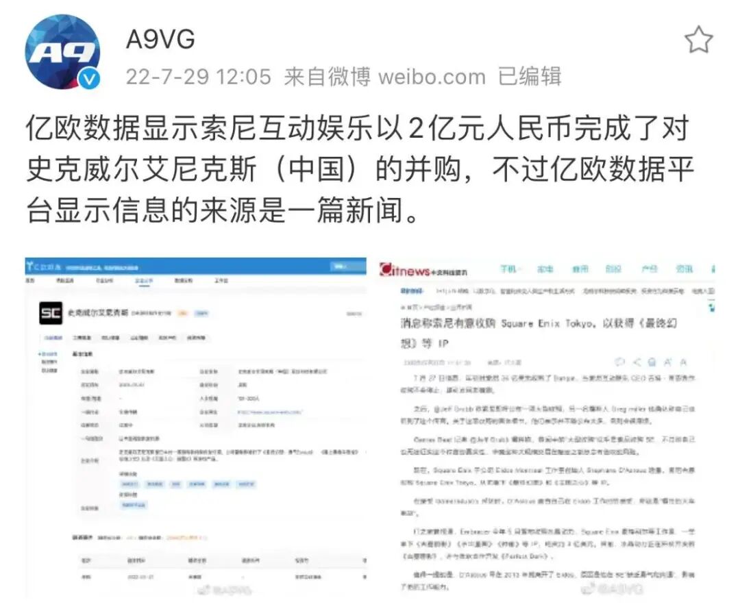 目前还不能确认信息的真实度,但是根据这篇亿欧数据中的报道显示,索尼互动娱乐于7月27日完成了对史克威尔艾尼克斯(中国)的并购,具体金额尚未披露。