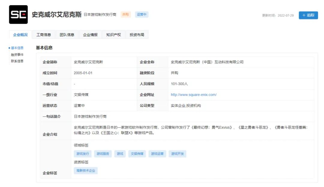 这家全资子公司可能大家不太清楚,史克威尔艾尼克斯(中国)目前运营的项目包括《魔力宝贝》、《幻想大陆》等史克威尔艾尼克斯网游作品项目,算是运营为主。