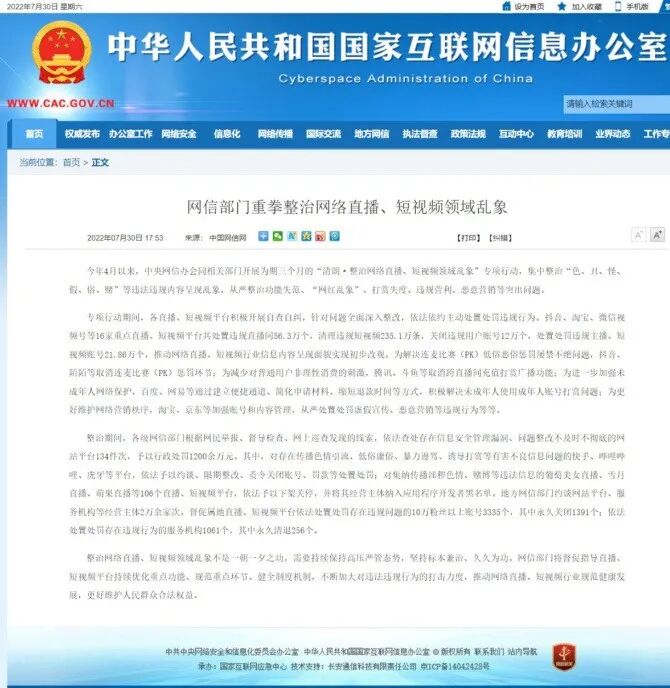 网信办除了“重拳出击”了短视频直播领域以外,在2022年上半年,全国网信系统上半年累计依法约谈网站平台3491家,警告3052家,罚款处罚283家,暂停功能或更新419家,下架移动应用程序177款。
