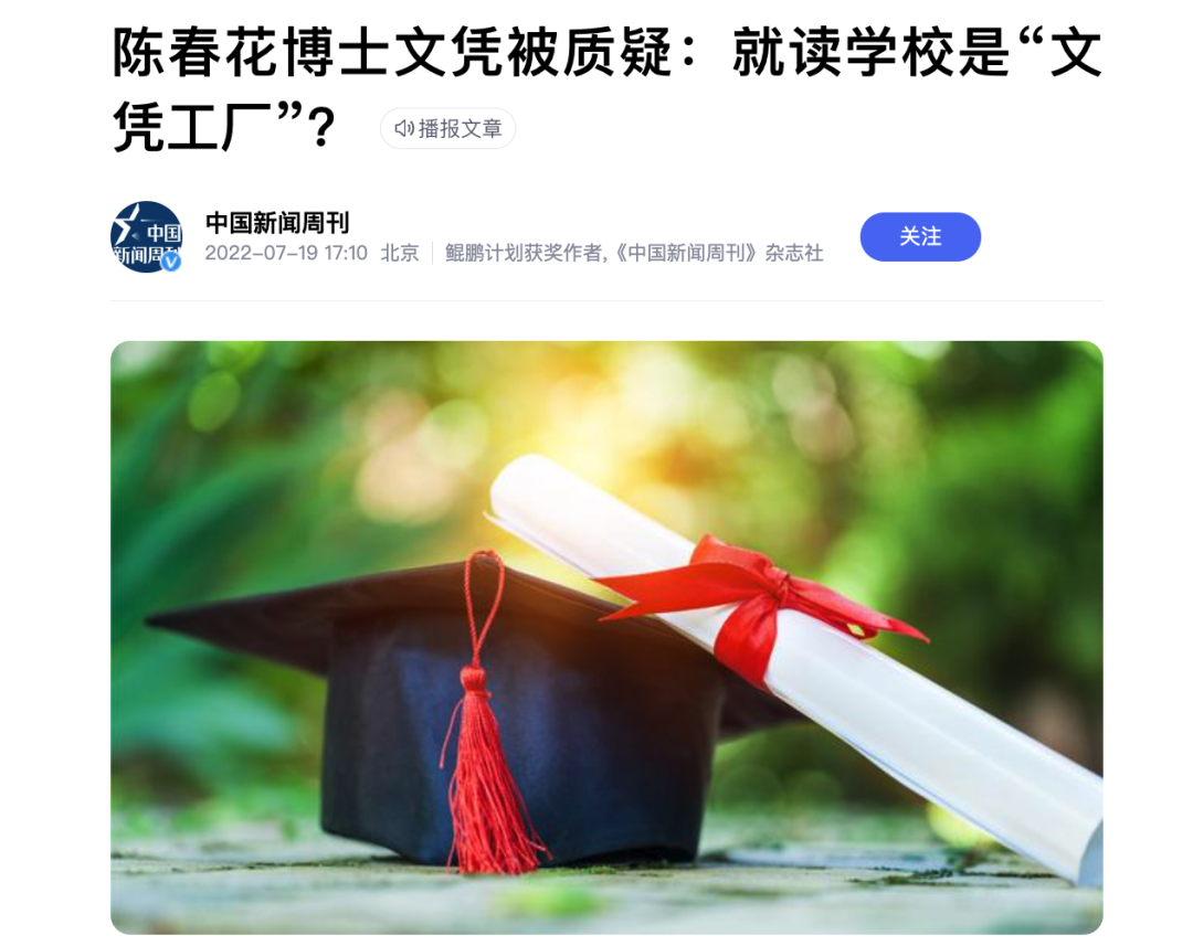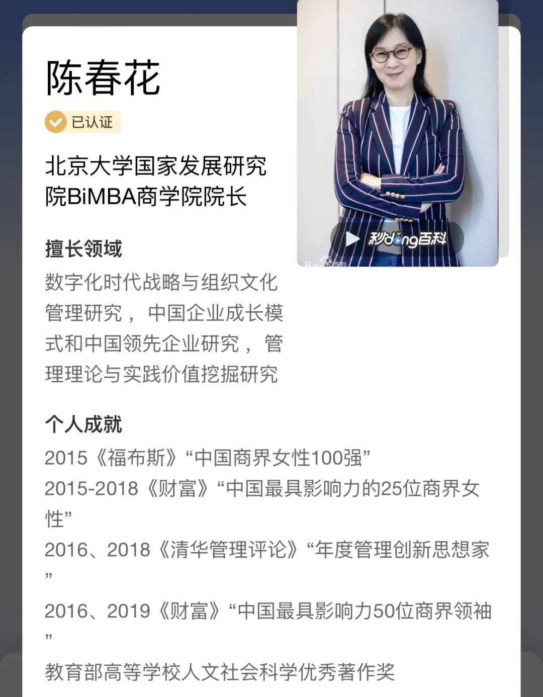 首先,据@中国新闻周刊报道,陈春花博士的文凭被质疑。