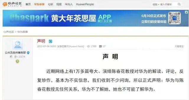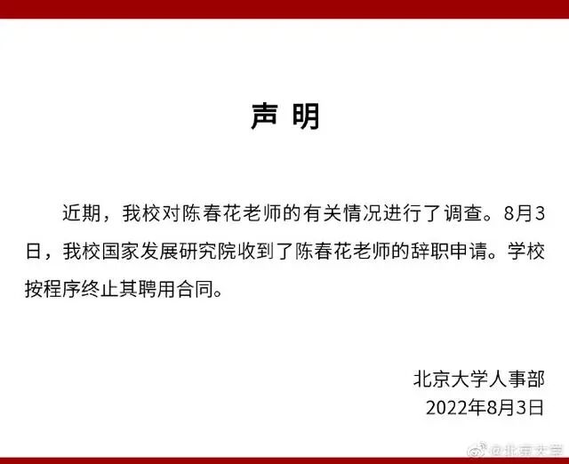 紧接着,北京大学发布声明称,已经收到陈春花的辞职申请,学习将按程序终止其聘用合同。