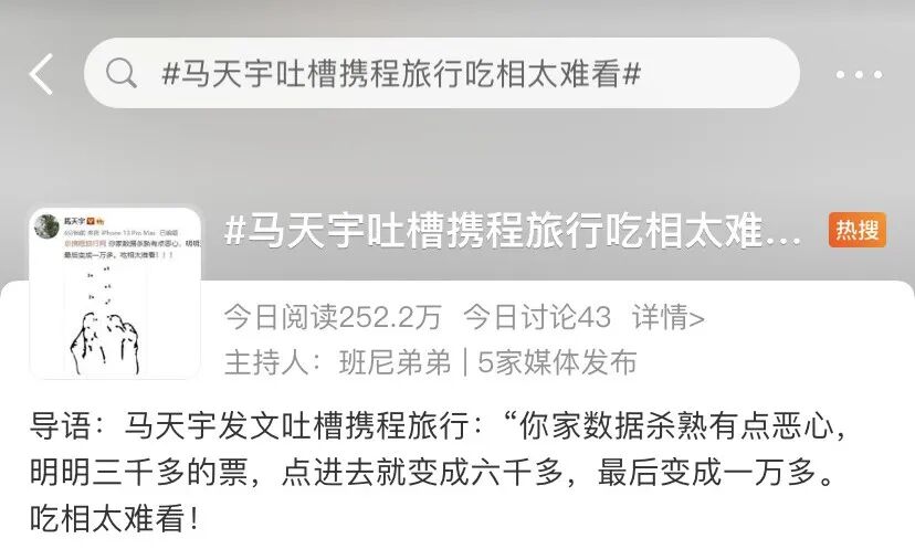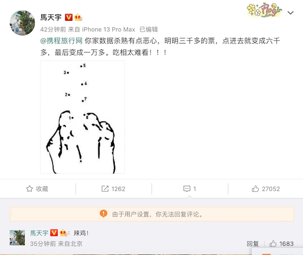 最近,艺人马天宇就在社交平台发文指责旅行平台——携程利用大数据“杀熟”。