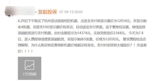 他在购买杭州至法国的机票时,点进去发现支付前显示票价为12034元,并剩余4张票,但是支付时显示票价有变动,且自动退出支付界面