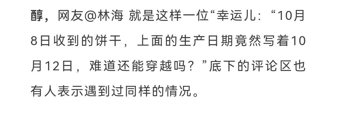 比如网友@临海10月8日收到的饼干边角料,生产日期竟然写着10月12日……