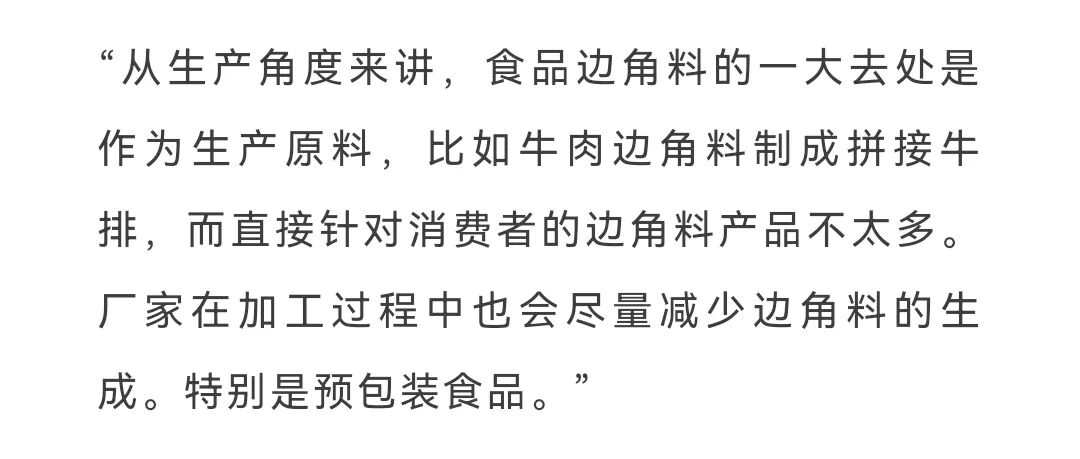 “食品边角料的一大去处是作为生产原料,直接针对消费者的边角料产品不太多,而且厂家在加工过程中也会尽量减少边角料的生成。”