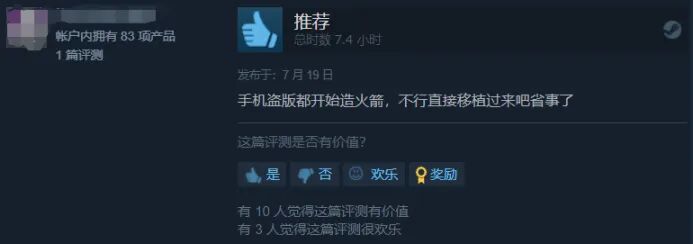 为了研究它是怎么被盗版打败的,我还专门买了玩一会,创意可以说真的特别有趣,也配得上“特别好评”这个评价,算是我近期比较难得的摸鱼游戏,十几分钟一把,很上头。