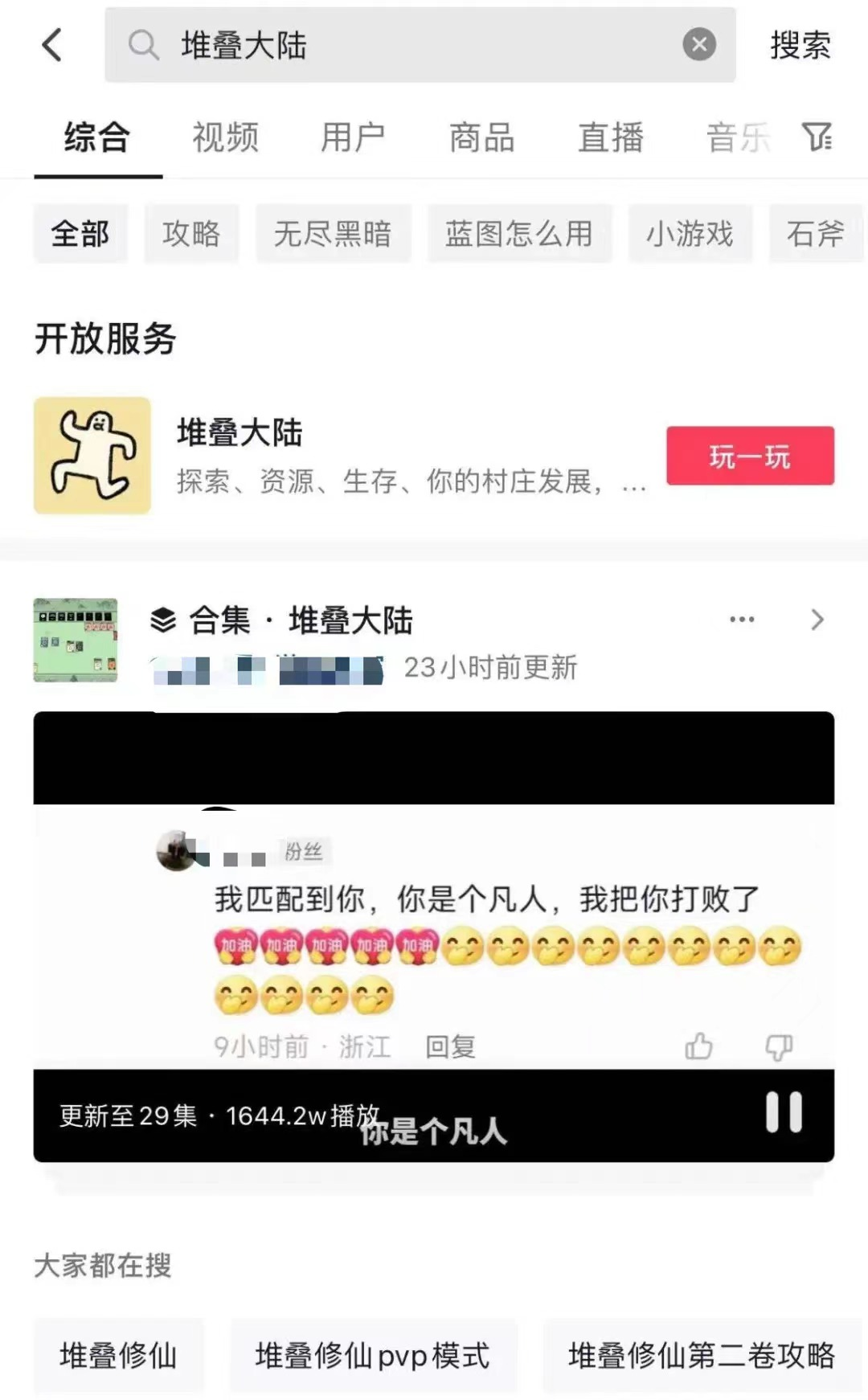 打开某音搜索《堆叠大陆》,出现在首位的就是。