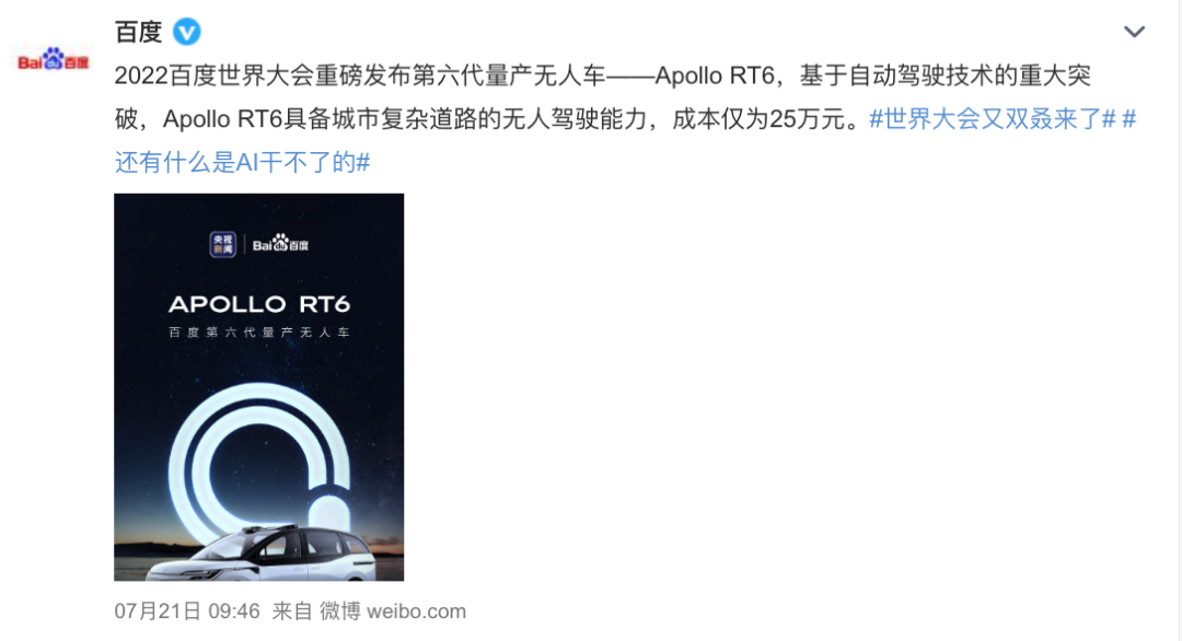而参考最近宣布的第六代车上,百度透露其成本仅25万。