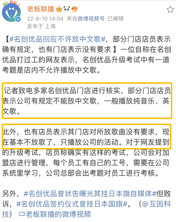 此外,一位自称在名创优品打过工的网友表示,名创优品升级考试中有一道考题是店内不允许播放中文歌。