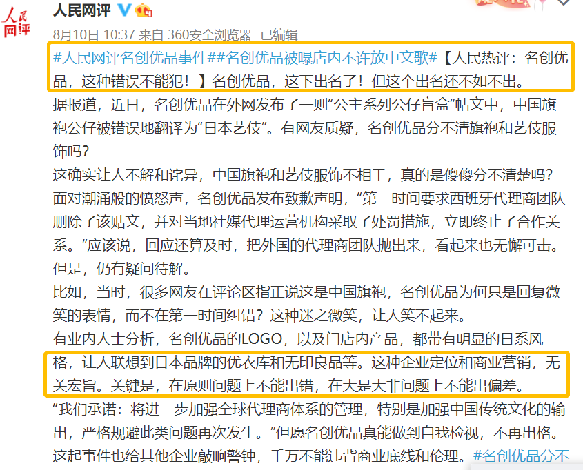 “但愿名创优品真能做到自我检视,不再出格。这起事件也给其他企业敲响警钟,千万不能违背商业底线和伦理。”