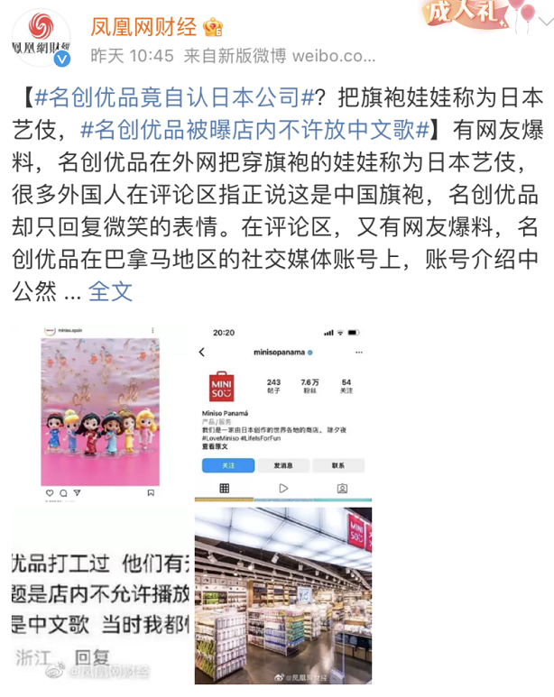 随后又有网友发文称,名创优品巴拿马地区的社交账号写着:“我们是一家由日本创造的商店”。