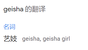 注意它用的单词是“Geisha” ,翻译为艺伎,据百度百科解释艺伎是日本特有的一种女性表演艺术工作者,主业是陪客饮酒作乐。