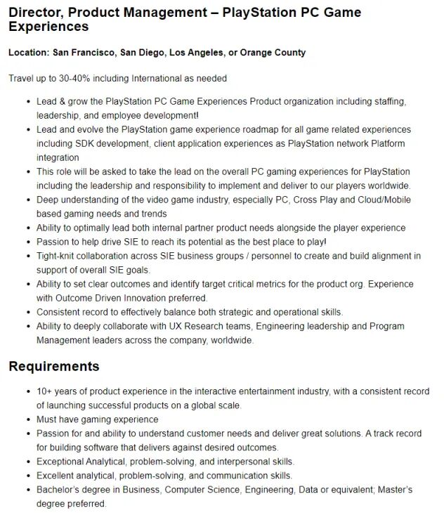 早在年初的时候,就有消息,曝出索尼正在招聘“PC游戏体验产品管理总监”,要求应聘者能“领导和发展PlayStation PC游戏体验产品的组织,包括人员配备、领导能力和员工发展。